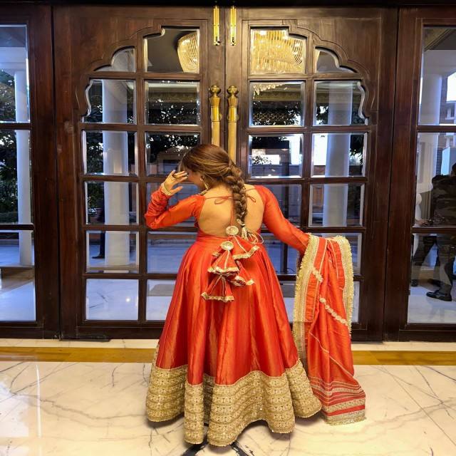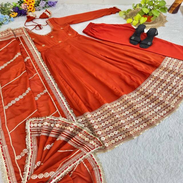 ชุดเดรส Anarkali ผ้าไหมชีนอน VASTRA COTTAGE พร้อมงานปักเลื่อมหนัก แต่งผ้าลูกไม้ด้านในด้วยผ้าฝ้าย พร้อมผ้าคลุมไหล่แบบ Dupatta และชุดเสื้อคลุมด้านล่าง