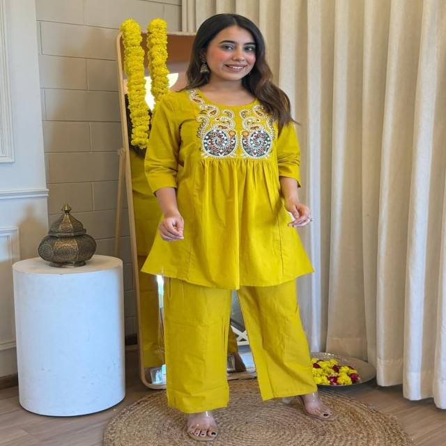 ชุดคุร์ตะปักลาย VASTRA COTTAGE สีมัสตาร์ด พร้อมกางเกงขายาว ชุดลำลองสำหรับผู้หญิง สวมใส่ได้ในงานปาร์ตี้ ชุดสไตล์ชาติพันธุ์