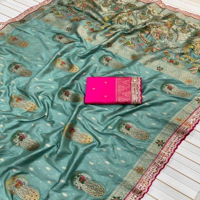 VASTRA COTTAGE Dola Silk Saree with Meenakari Zari Weaving Body Pallu Embroidered Sequence Work Border with Contrast Blouse
