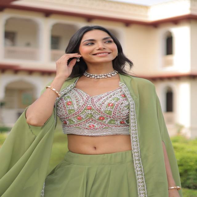 ชุดเลเฮนกาผ้าจอร์เจตต์เทียม VASTRA COTTAGE แบบเย็บสำเร็จ พร้อมเสื้อคลุมปักลายด้วยลูกปัดและด้าย บุผ้าฝ้ายอย่างดี ชุดสไตล์ชาติพันธุ์สุดหรู