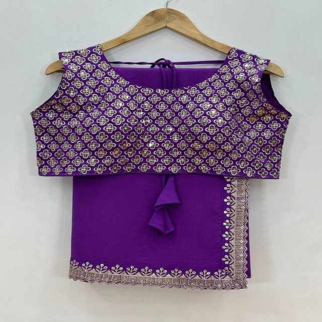 ผ้าซารี VASTRA COTTAGE ผ้าจอร์เจตต์เทียม แต่งเลื่อม ขอบฉลุลาย พร้อมเสื้อปักลายเต็มตัว แขนเสื้อเย็บติด