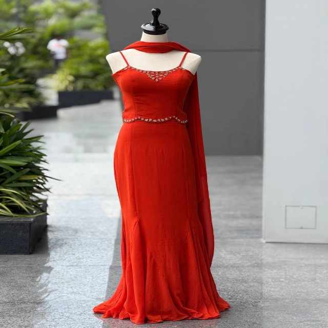 Vastra georgette เสื้อทำงานเพชรกับกระโปรงตัดปลาเย็บอย่างเต็มที่เสื้อเบลาส์ขอบเอวปรับได้และ dupatta