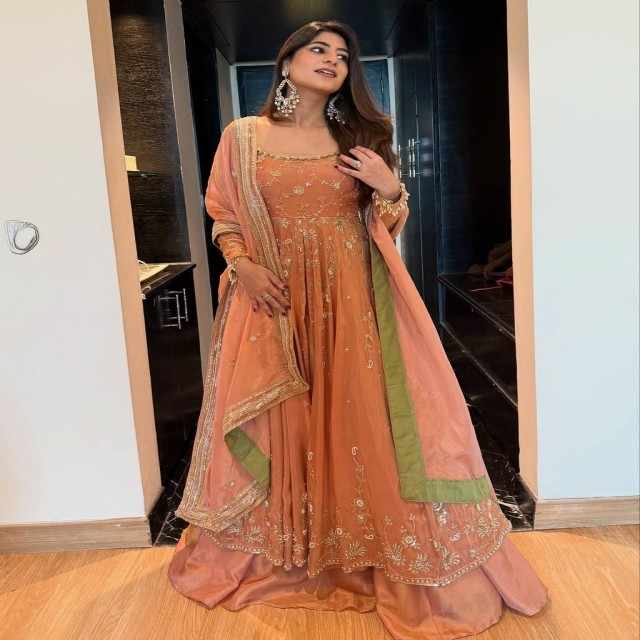 ชุดเลเฮนกาผ้าไหมชีนอนหนัก VASTRA COTTAGE พร้อมผ้าคลุมไหล่ปักลายด้วยด้ายและเลื่อม แต่งลูกไม้แฟนซี เหมาะสำหรับงานปาร์ตี้สำหรับผู้หญิง