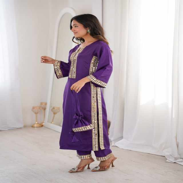 ชุดคุर्ติ VASTRA COTTAGE พร้อมกางเกงสำหรับผู้หญิง ชุดคุर्ติปักลายกระจกพร้อมกางเกงแขนกระดิ่ง สไตล์ชาติพันธุ์ สำหรับงานเทศกาล งานเลี้ยงลำลอง
