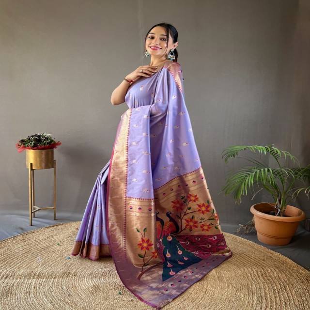 ผ้าไหมปาธานี วัสตรา คอทเทจ ซารี พร้อมขอบผ้าปัลลูที่มีลวดลายตัดกันอย่างสวยงาม และลายบุตติที่งดงาม เหมาะสำหรับงานแต่งงานแบบดั้งเดิม