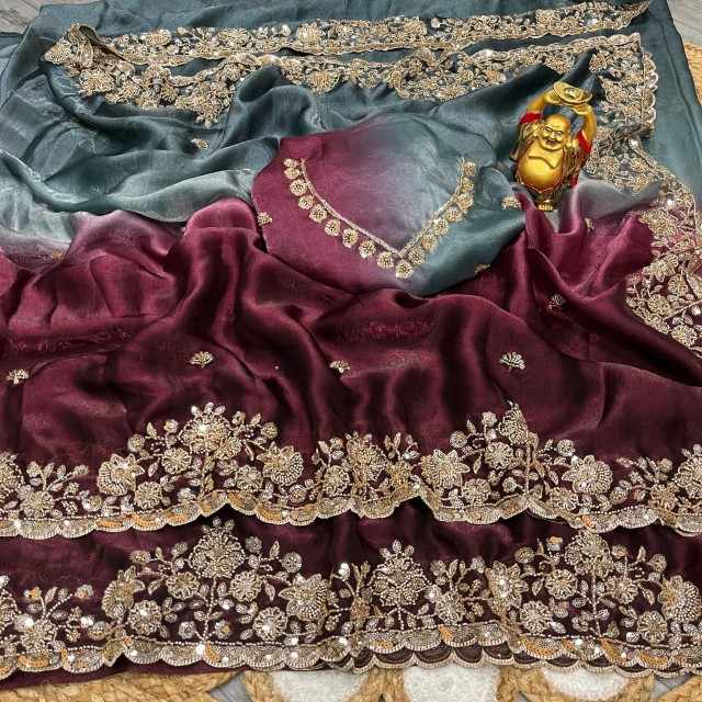 ชุดส่าหรีงานปาร์ตี้ VASTRA COTTAGE ประดับด้วยลูกปัดทองคำแท้ ผ้าไหมเนื้อนุ่มเงางาม พร้อมเสื้อปักลายด้วยมือ