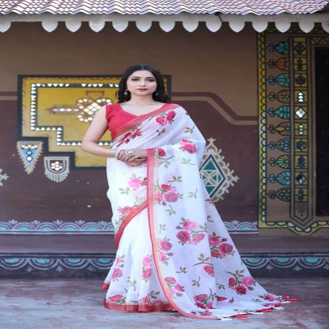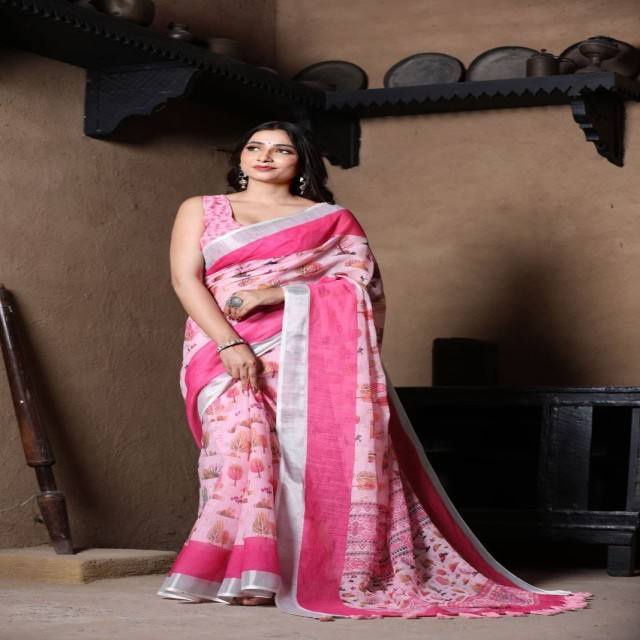 ผ้าซารีลินินพรีเมียม VASTRA COTTAGE พร้อมขอบลายซิลเวอร์ซารีแบบดิจิทัลพิมพ์ และเสื้อผ้าลินินพิมพ์ลายดิจิทัลเข้าชุด