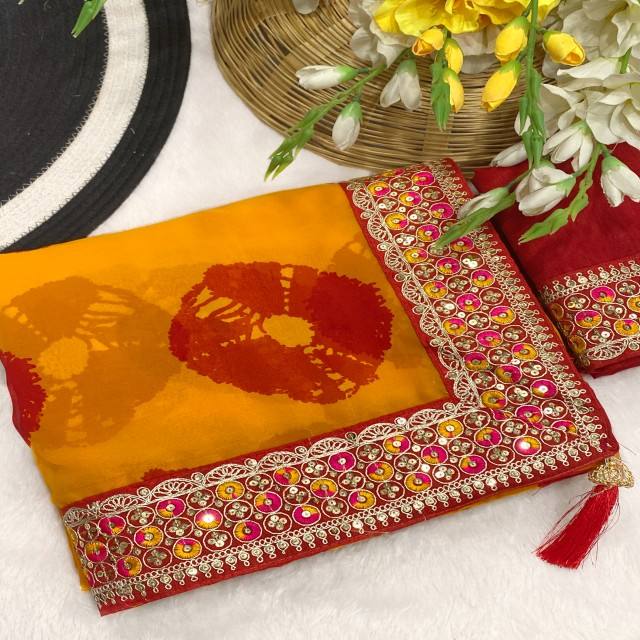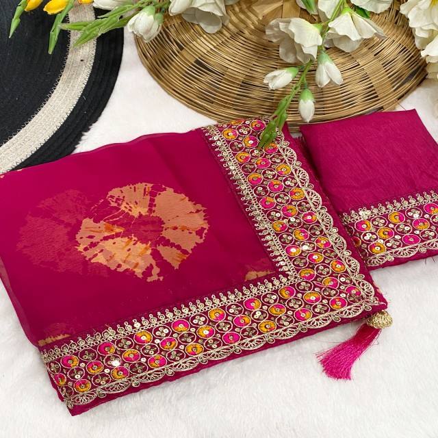 Vastra คอทเทจพรีเมี่ยมสีม่วงแดงชิโบริพิมพ์ลาย Georgette Saree พร้อมกระจกหนาปักขอบสำหรับงานแต่งงานและงานปาร์ตี้