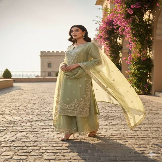ชุดคุร์ตีผ้าไหมพรีเมียม VASTRA COTTAGE พร้อมผ้าคลุมไหล่และกางเกงขายาวปักลาย ตัดเย็บสำเร็จพร้อมซับในผ้าฝ้ายเนื้อนุ่ม เหมาะสำหรับงานปาร์ตี้และงานเฉลิมฉลอง