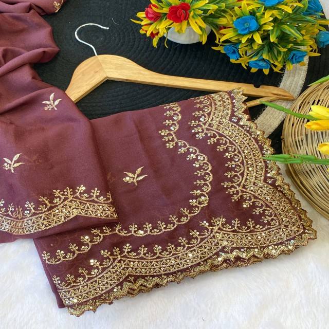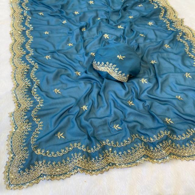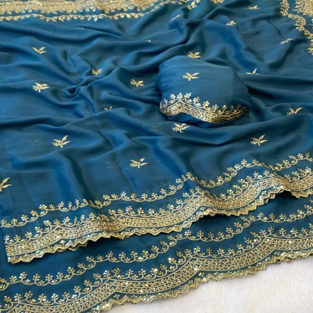 ผ้าซารี VASTRA COTTAGE รุ่นพรีเมียม สีฟ้าอมเขียว ลายดาว ทำจากผ้าจอร์เจตต์ พร้อมงานปัก สำหรับงานเทศกาล