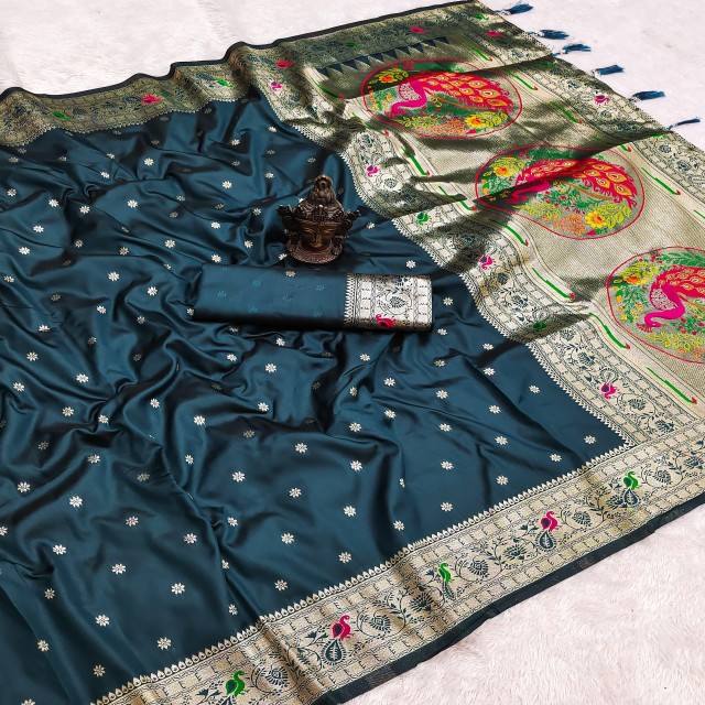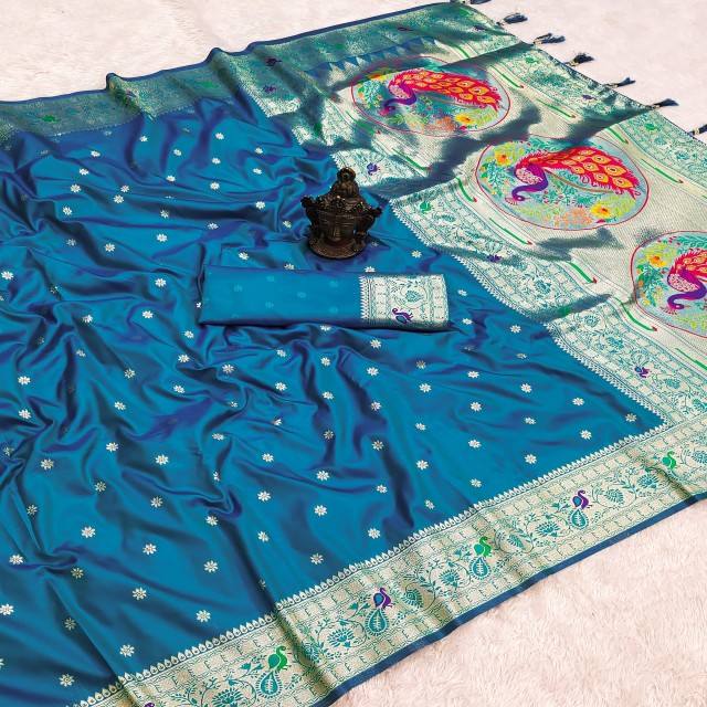ผ้าซารีไหมบานาราซีแท้ VASTRA COTTAGE พร้อมลายปักด้วยด้ายซารีทั่วผืน ดีไซน์หรูหราด้วยผ้าปาลูที่มีสีตัดกัน พร้อมเสื้อทอผ้าซารี