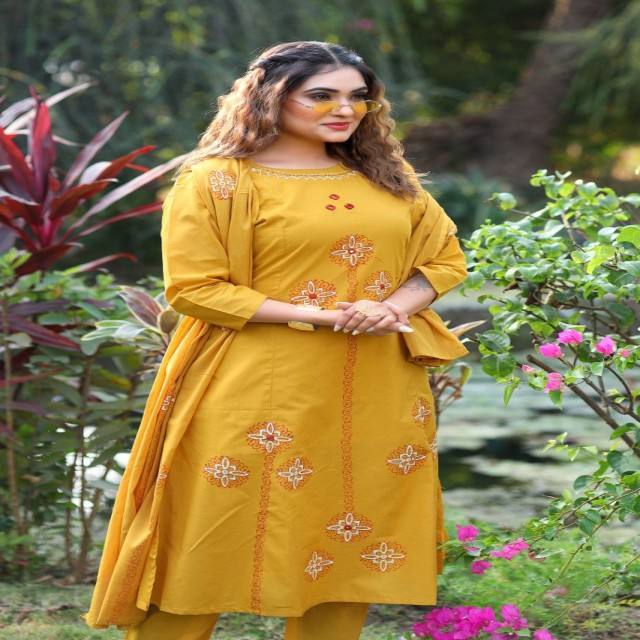 ชุดสูทผ้าฝ้ายแท้ VASTRA COTTAGE สีมัสตาร์ด พร้อมผ้าคลุมไหล่ผ้าฝ้ายพิมพ์ลายด้วยมือ และชุดเดรสปักลายกระจกแท้ด้วยมือ