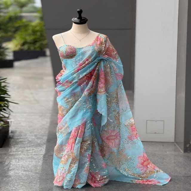 ผ้าซารี VASTRA COTTAGE ผ้าจอร์เจียต์เทียมแท้ ประดับลูกปัดและเลื่อม งานฝีมือ พร้อมเสื้อคลุมแบบไม่เย็บติด สำหรับงานปาร์ตี้