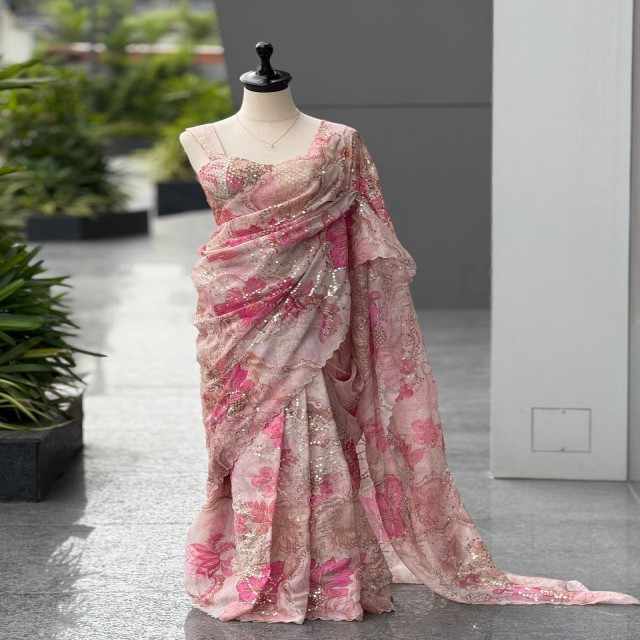ผ้าซารี VASTRA COTTAGE ผ้าจอร์เจียต์เทียมแท้ ประดับลูกปัดและเลื่อม งานฝีมือ พร้อมเสื้อคลุมแบบไม่เย็บติด สำหรับงานปาร์ตี้
