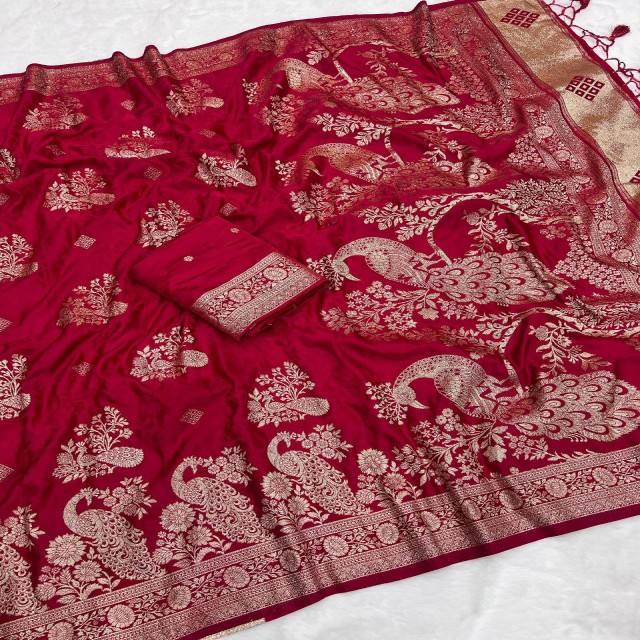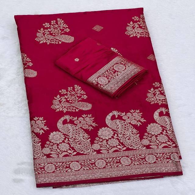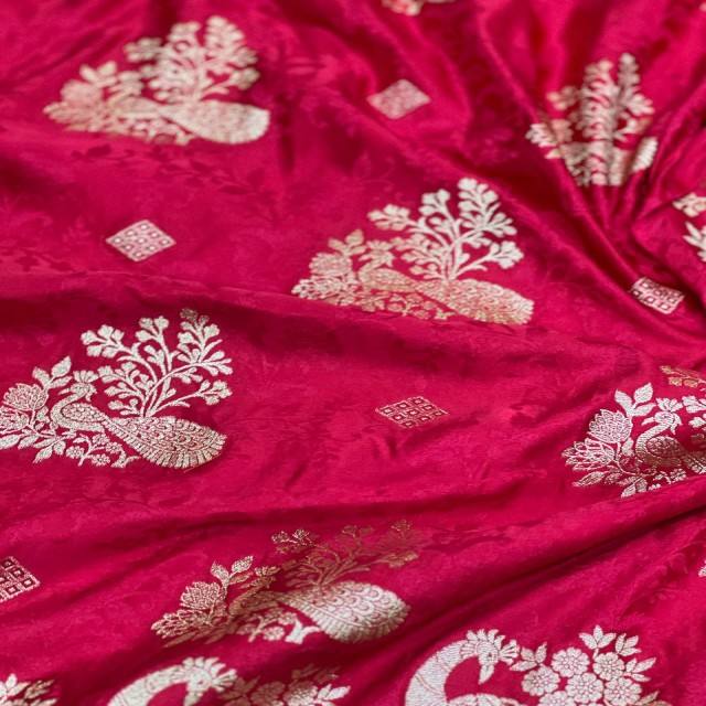 ผ้าส่าหรี VASTRA COTTAGE ผ้าไหมซาตินแท้ ทอลายแจ็คการ์ด พร้อมลายปักรูปนกยูงที่ขอบผ้า พร้อมพู่ห้อยพาลลูสุดหรู ชุดเสื้อที่ย้อมสีด้วยมือ