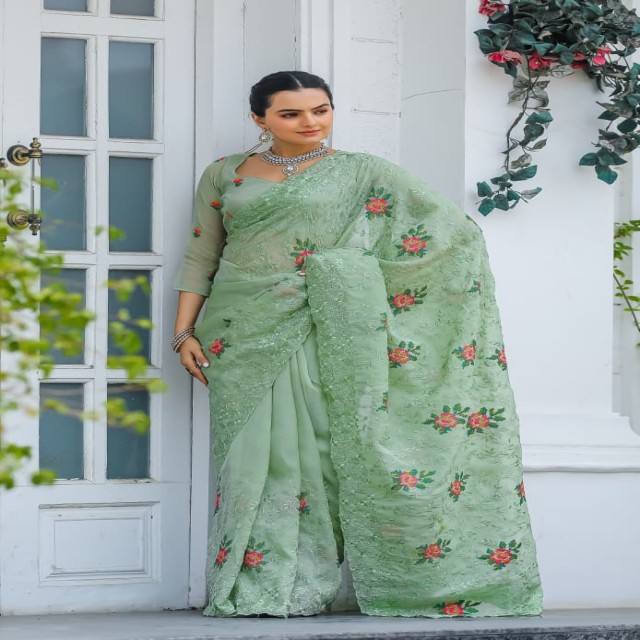 Vastra คอทเทจสารีรสินชิฟฟ่อนซารีประกายแวววาวพร้อมครอสติชรูปปักลายดอกไม้ทั่วและขอบตัดอย่างหรูหรา