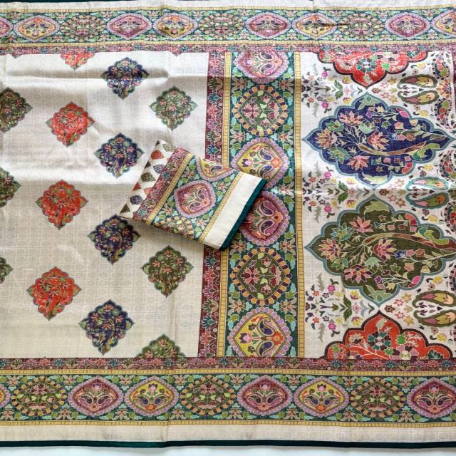 Vastra Cottage Saree ผ้าไหมแท้มีผ้าห่อศพลายพิมพ์ดิจิตอลสไตล์แคชเมียร์พร้อมชุดเสื้อ