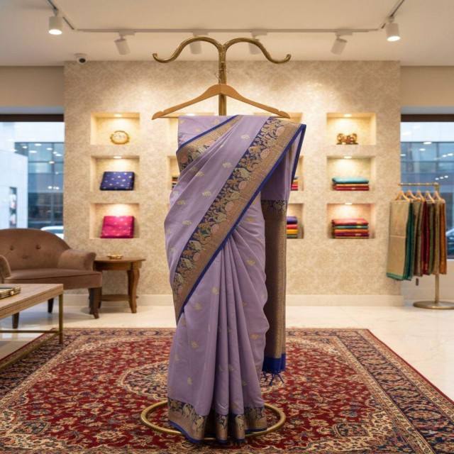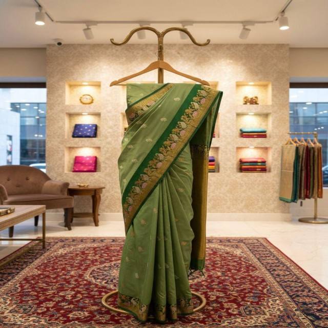 ผ้าซิ่นไหมเนื้อนุ่ม VASTRA COTTAGE พร้อมลายปักดิ้นเงิน-ทองแบบ Zari Jacquard ขอบผ้า Meena ประดับด้วยลาย Zari Butti และพู่ห้อย พร้อมเสื้อคลุมเข้าชุด
