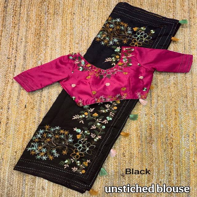 ผ้าส่าหรีคอตตอนทัสเซอร์ วาสตรา คอตเทจ พร้อมงานปักดิ้นสไตล์แคชเมียร์ ตกแต่งขอบด้วยงานปักแบบกะตะ พร้อมพู่ห้อยที่ชายผ้าส่าหรี พร้อมเสื้อคลุม