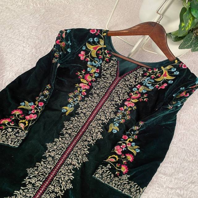ชุดเซ็ตกำมะหยี่ VASTRA COTTAGE สำหรับฤดูหนาว พร้อมเสื้อปักลาย ชุดกำมะหยี่ทรงปล่อยขาแบบ Plazzo ชุดออกงานหรูหราสไตล์ชาติพันธุ์สำหรับผู้หญิง