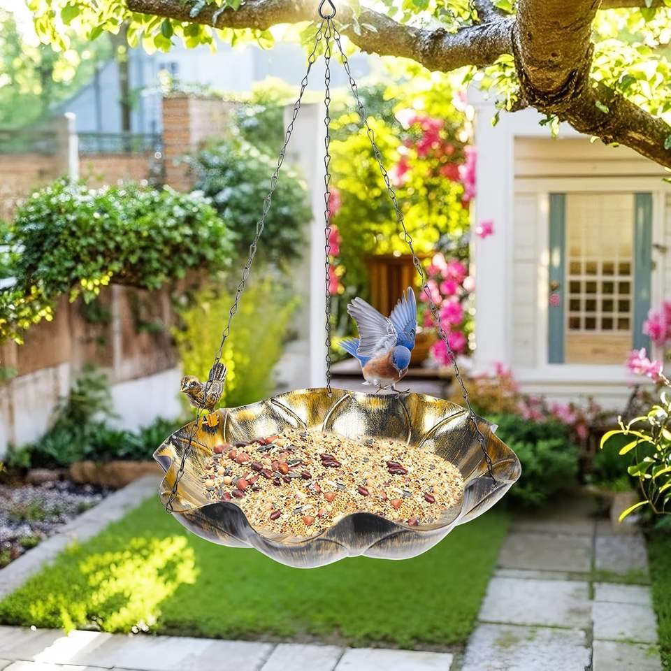 อ่างน้ำนกแขวนกลางแจ้งแบบเป็นมิตรกับสิ่งแวดล้อม ทำจากโลหะสีทอง ใช้เป็นที่ให้อาหารนก ตกแต่งสวนและลานบ้าน เหมาะสำหรับการดูนกในสวนหลังบ้าน