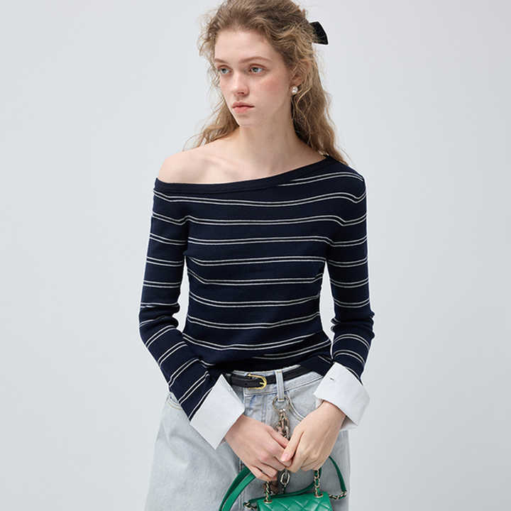 VEGA CHANG เสื้อยืดผ้าวูลลายทางสำหรับผู้หญิงแบบเปิดไหล่ ดีไซน์ไหล่ข้างเดียว สีกรมท่าขาวลายทาง เสื้อลำลอง