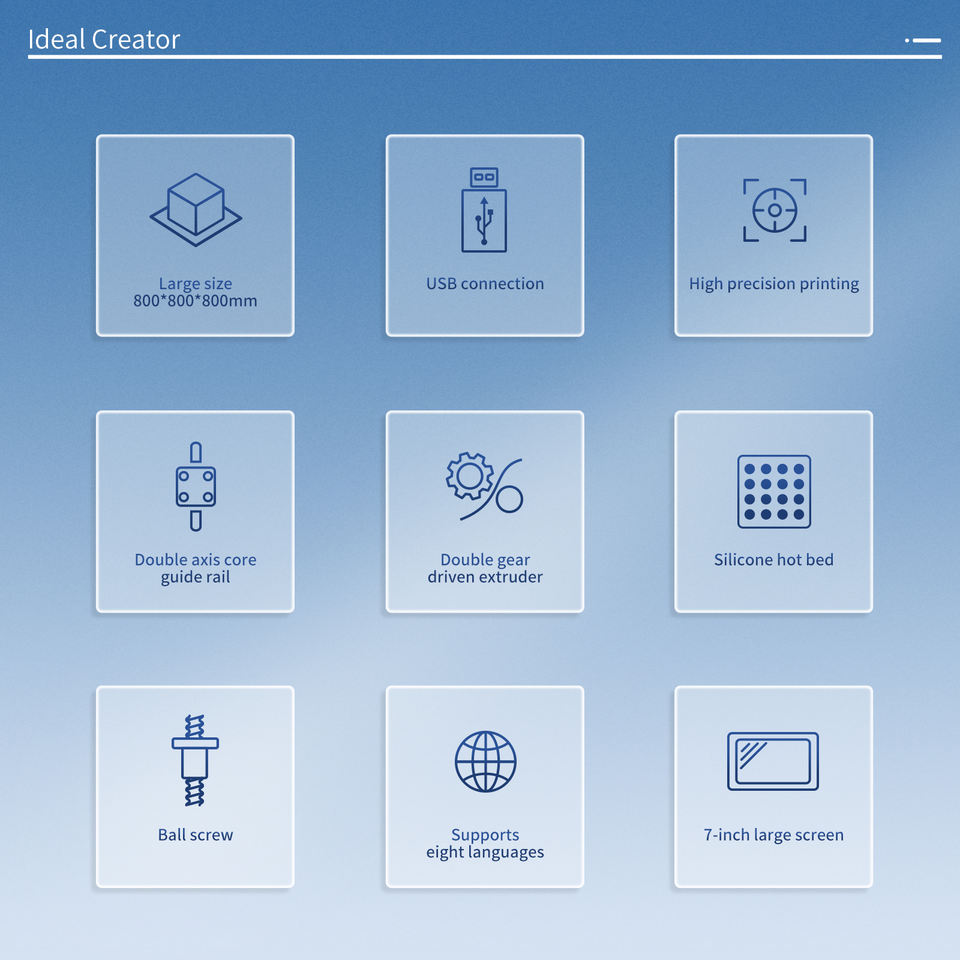 คุณสมบัติ:หลายแกน, เตียงอุ่น, Resume การพิมพ์, Filament Detection, ปรับระดับอัตโนมัติ, ขนาดใหญ่
