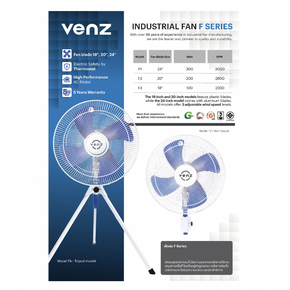 พัดลมอุตสาหกรรม VENZ ใบพัดสีน้ำเงิน ขนาด 18 นิ้ว แบบติดผนัง รุ่น F30C ประหยัดพลังงาน สำหรับอุตสาหกรรม สำนักงานกลางแจ้ง โรงแรม และครัวเรือน