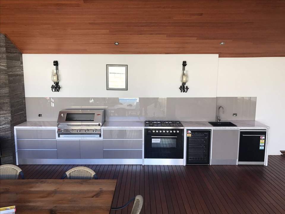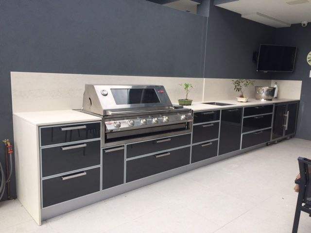 ตู้ครัวบาร์บีคิวกลางแจ้งแบบปรับแต่งได้ VERMONHOUZZ สไตล์หรูหราเรียบง่าย กึ่งกลางแจ้ง ทนต่อคราบน้ำมันและควัน
