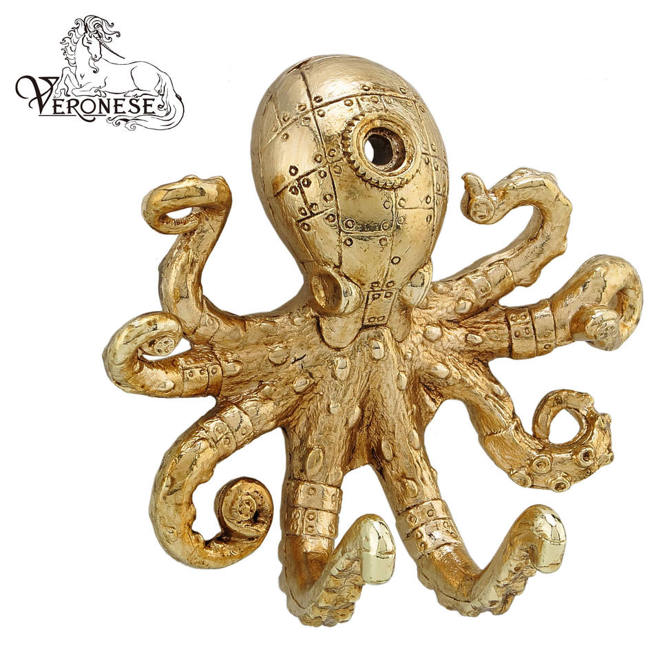 VERONESE DESIGN ตะขอแขวนผนังรูปปลาหมึกสไตล์สตีมพังก์สีทองโบราณ งานศิลปะเรซิ่นเพ้นท์มือและของสะสม-ของตกแต่งบ้าน