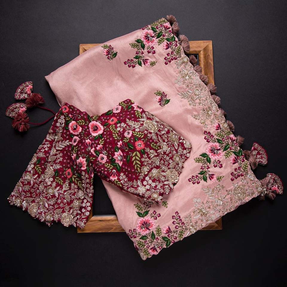 ชุดส่าหรีงานปักเลื่อมสวยหรู ดีไซน์พิเศษ ผ้าจอร์เจตต์ พร้อมเสื้อปักเลื่อมหนักแน่น จาก MEETALI CREATION