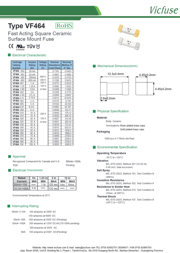 50mA~3.15A: 100 amperes at 350V AC, 100 amperes at 600V DC, 50mA~16A: 500 amperes at 250V DC (Pending), 50mA~100A: 300 amperes at 125V DC/AC(70-100A pendi, 300 amperes at 250V AC, 60A: 100 amperes at 250V DC(Pending)ทำลายความจุ