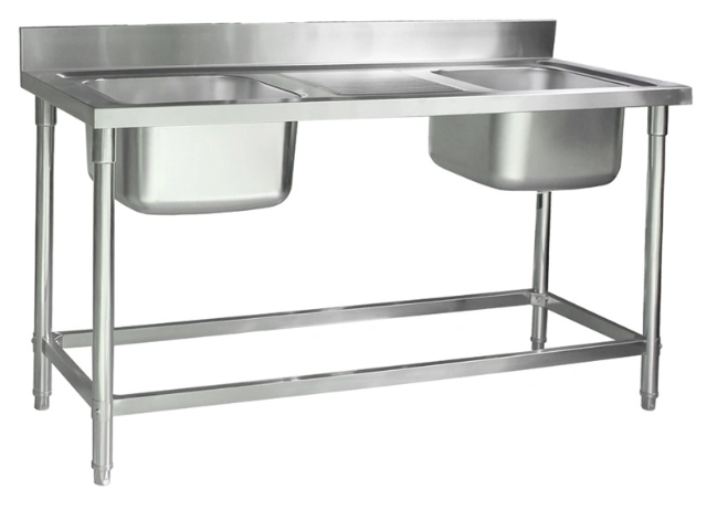 Victory อ่างล้างจานสแตนเลสคู่พร้อมกระดานระบายน้ำสำหรับโรงแรมและร้านอาหาร