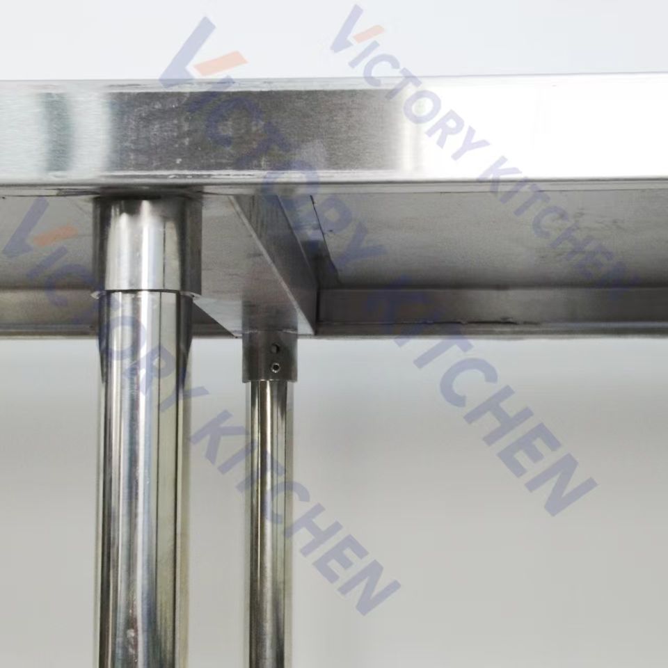โต๊ะเตรียมอาหารสแตนเลส 304 ยี่ห้อ VICTORY KITCHEN ดีไซน์ 6 ขา ผิวขัดเงา พร้อมล้อเลื่อน รับน้ำหนักได้ 500 กก./ตร.ม.