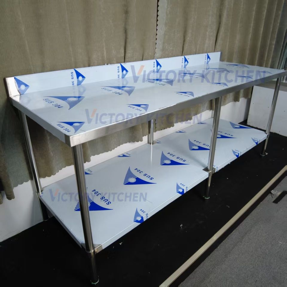 Victory โต๊ะทำงานทำจากสเตนเลสสตีล6ขาพร้อมแบ็คบอร์ดแบ็คสแปลชสำหรับงานพาณิชย์ Mayalsia