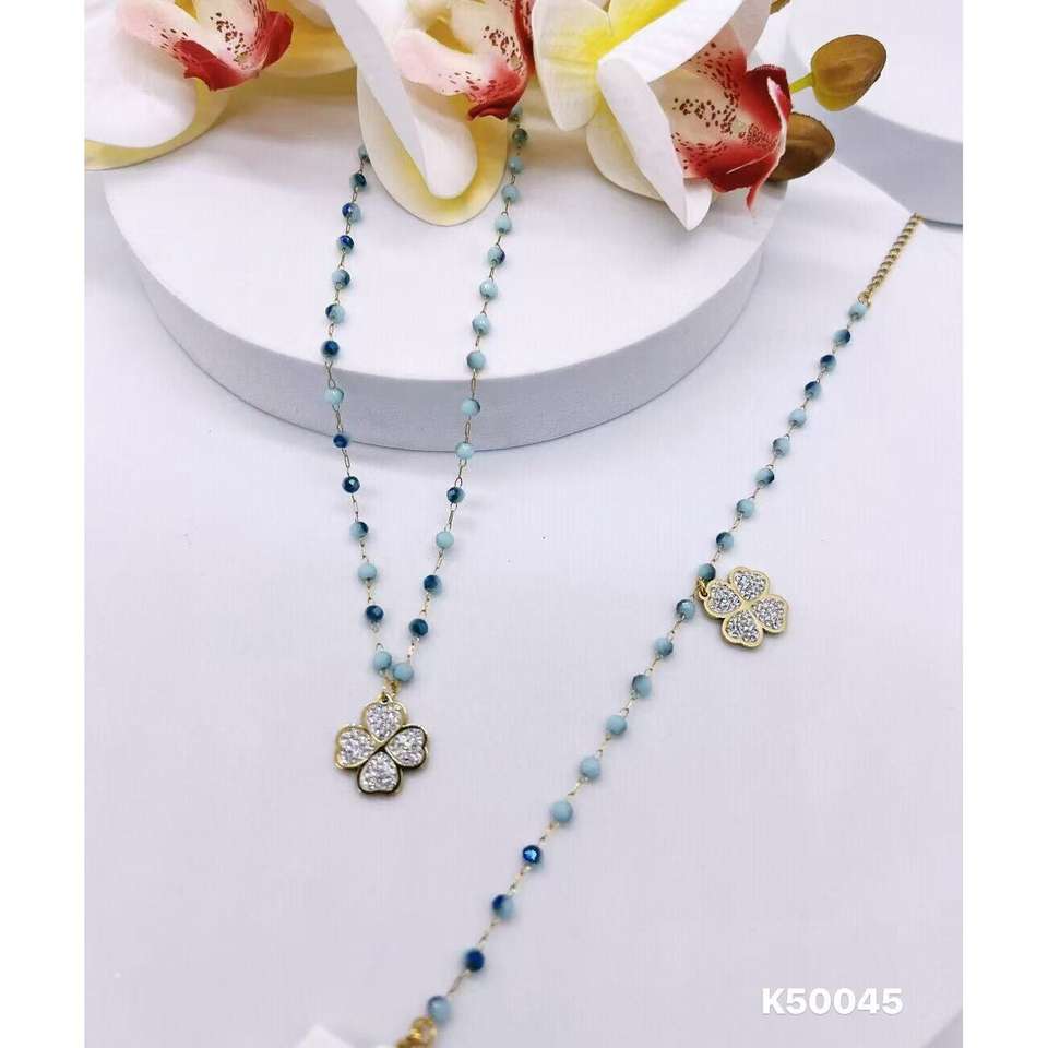 VIKILADY 585 ชุดเครื่องประดับลูกปัดสแตนเลส 316L ชุบทอง ลูกปัดคริสตัลสีเบจ สร้อยคอโคลเวอร์สี่แฉก + เครื่องประดับแฟชั่น