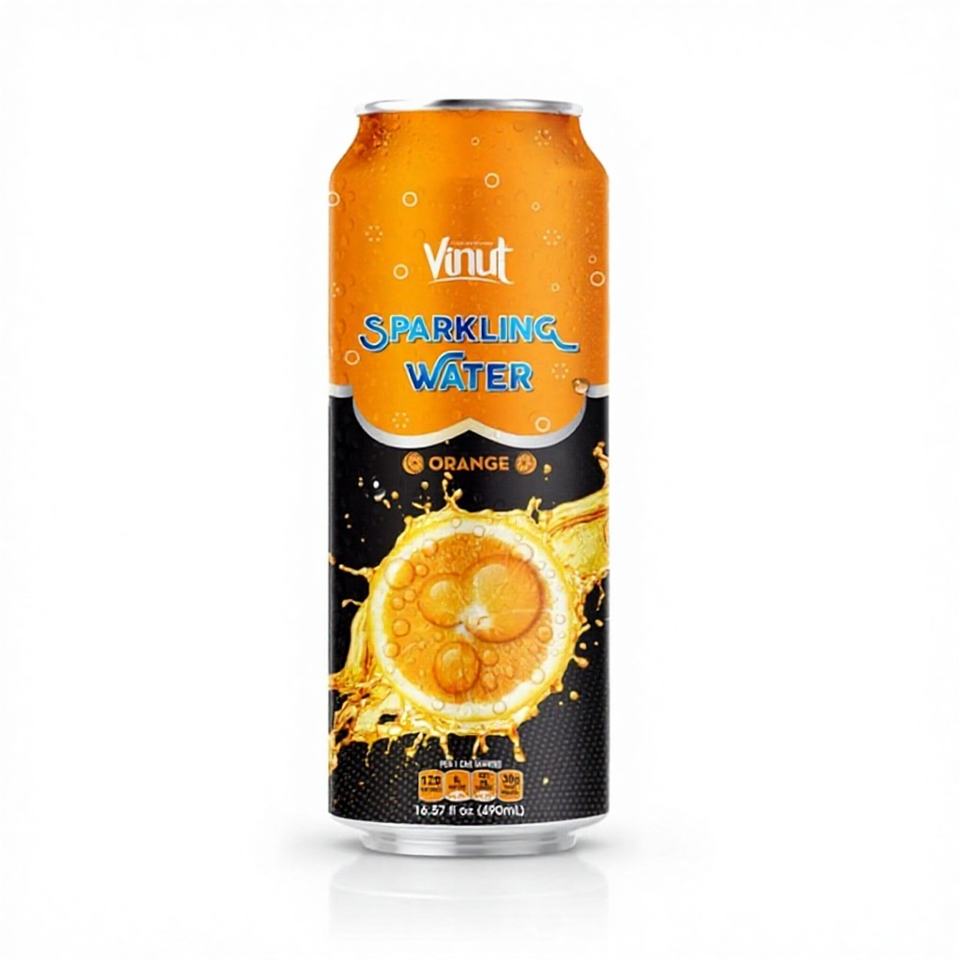 น้ำสปาร์คกลิ้งรสส้ม VINUT ขนาด 16.57 ออนซ์ ได้รับการรับรองมาตรฐาน ISO น้ำผลไม้สด 100% บรรจุ 24 กระป๋อง ผลิตในเวียดนาม