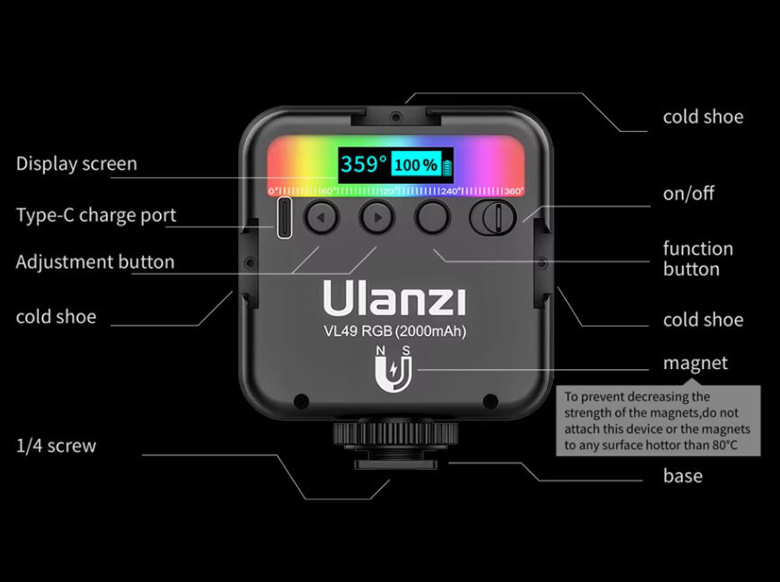 VL49 ulanzi ไฟวิดีโอ LED สี RGB 2500K-9000K 800LUX แม่เหล็กกรอกข้อมูลขนาดเล็ก3 Cold SHOE 2000mAh ชนิด C ไฟกล้อง