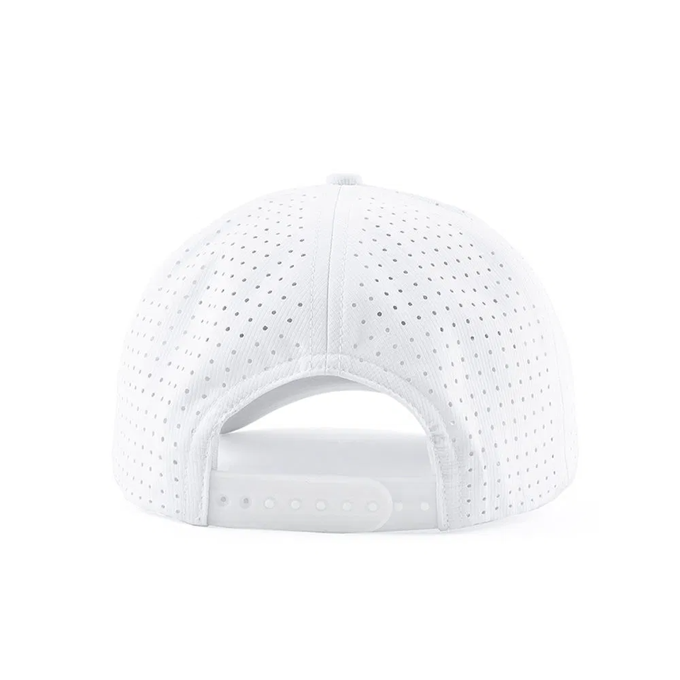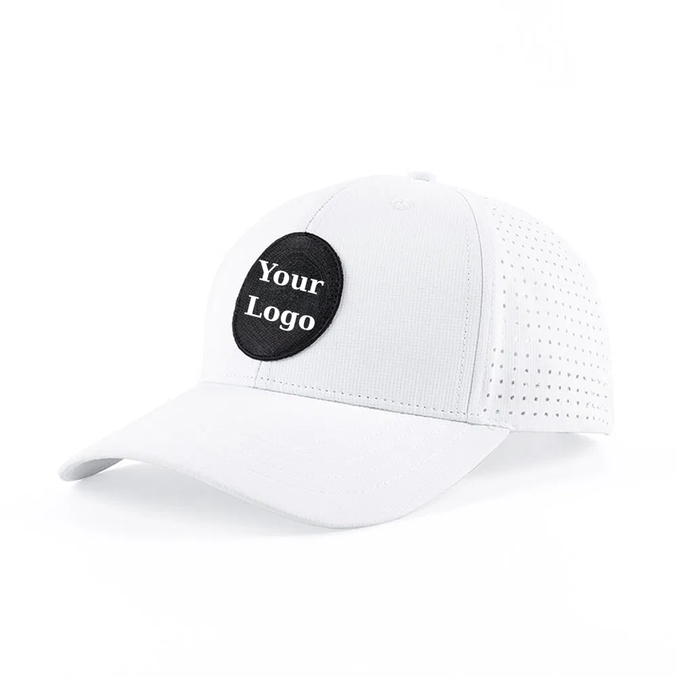 หมวกกอล์ฟ5แผงสำหรับตัดด้วยเลเซอร์รูผ้าทอโลโก้100% โพลีเอสเตอร์กันน้ำปิดด้านหลังทำจากพลาสติก