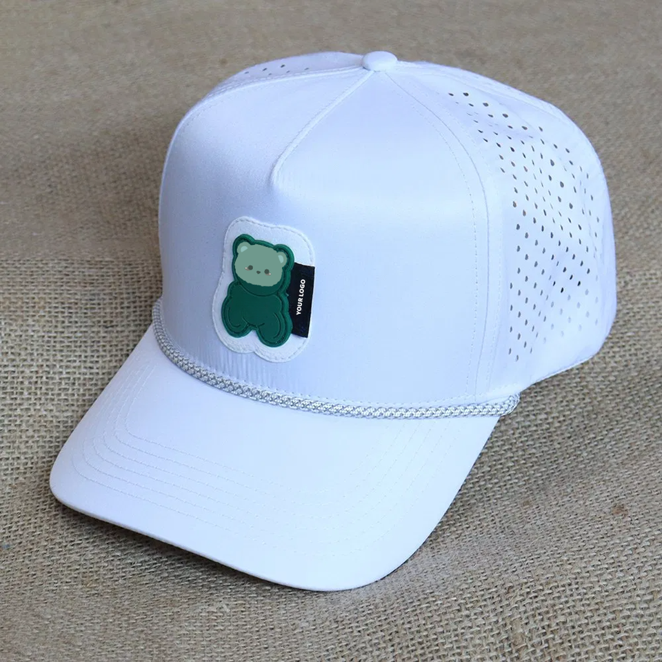 VN หมวกกอล์ฟยางพีวีซี5แผงพร้อมรูตัดด้วยเลเซอร์หมวกเบสบอลกันน้ำที่มีชื่อป้ายเชือกพลาสติกด้านหลัง