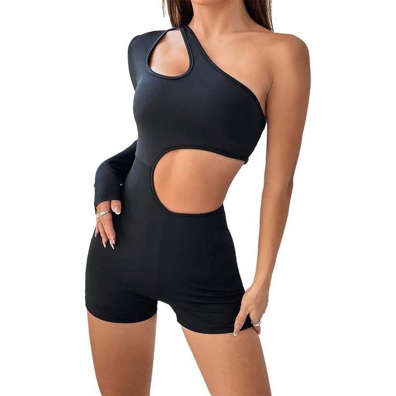 ชุดจั๊มสูทขาสั้นแบบเปิดไหล่ข้างเดียวสำหรับผู้หญิง VOIKERDR ผ้าสแปนเด็กซ์โพลีเอสเตอร์ ชุดบอดี้สูทแบบสปอร์ต ชุดรอมเปอร์ขาสั้น ชุดเข้าเซ็ต