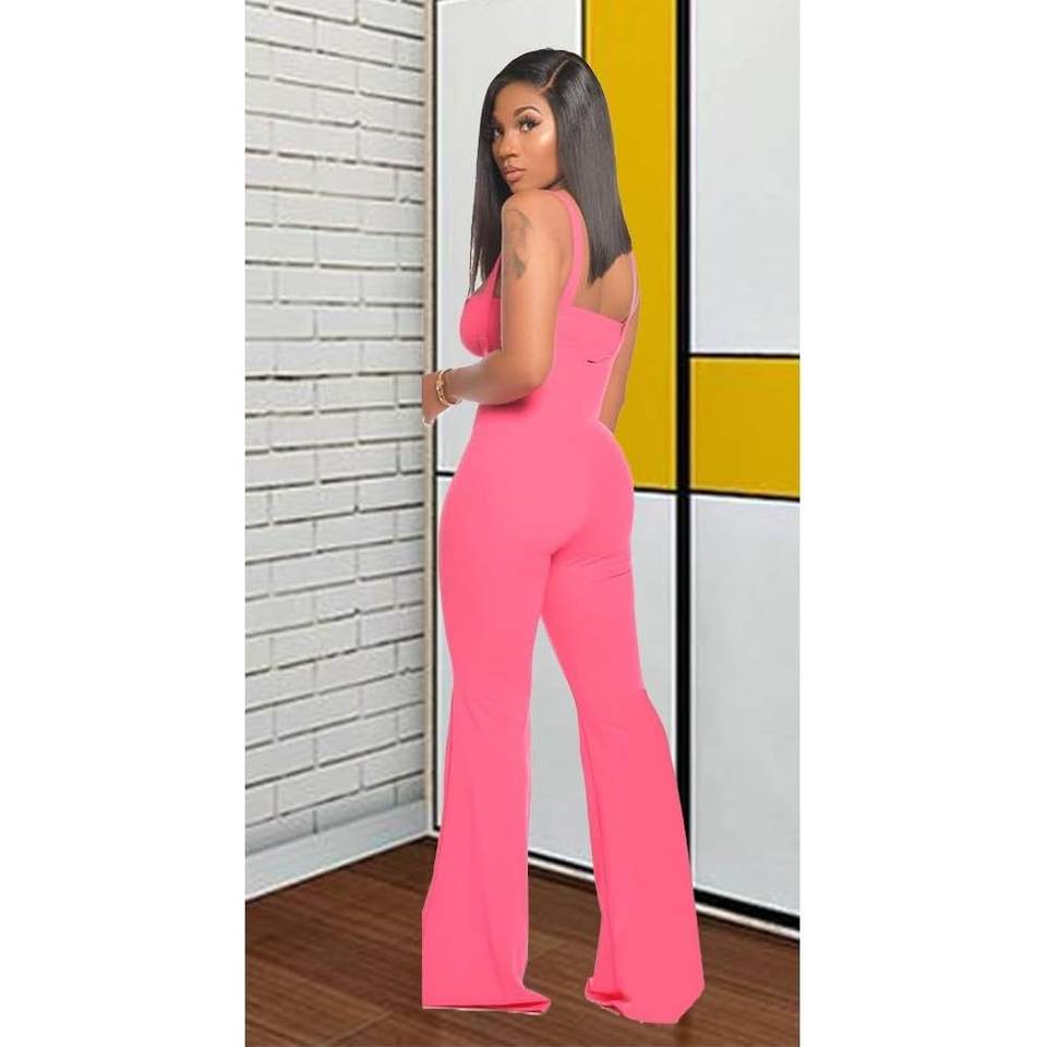 VOIKERDR จั๊มสูทเอวสูงของผู้หญิง กางเกงขาบานสีชมพู ชุดปาร์ตี้คลับ วัสดุเครป ชุดเดรสชิ้นเดียว