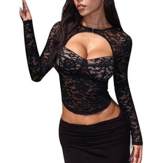 VOIKERDR เสื้อครอปแขนยาวลูกไม้สำหรับผู้หญิง เสื้อพูลโอเวอร์แบบโปร่งบาง ผ้าสแปนเด็กซ์โพลีเอสเตอร์เนื้อนุ่ม เสื้อถักทันสมัย