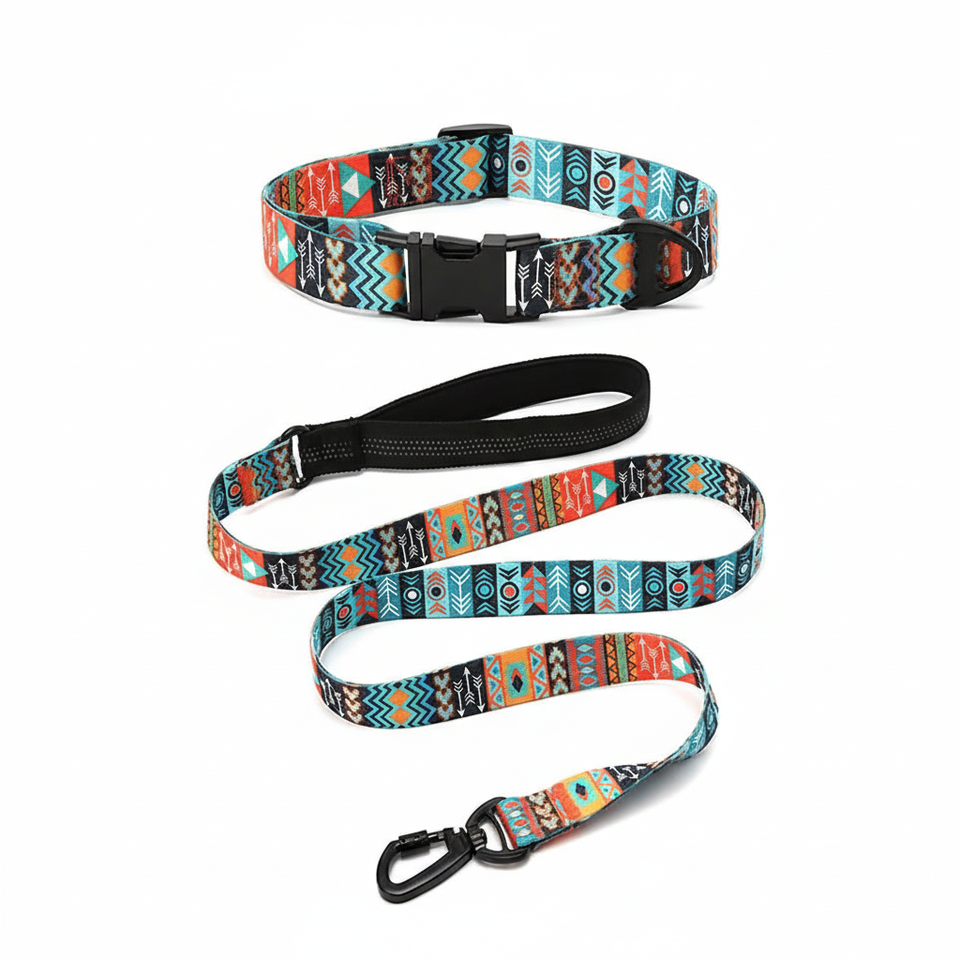 Vvmeetyou ชุดสุนัขสไตล์โบฮีเมียนนุ่มปรับได้สไตล์ชาติพันธุ์พร้อมหัวเข็มขัดโลหะและที่จับเบาะ4Ft ที่จับคู่กับสายจูง