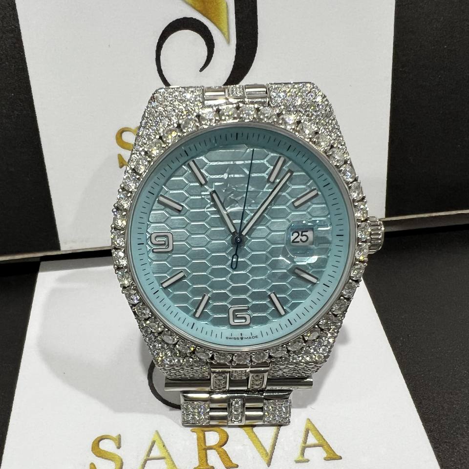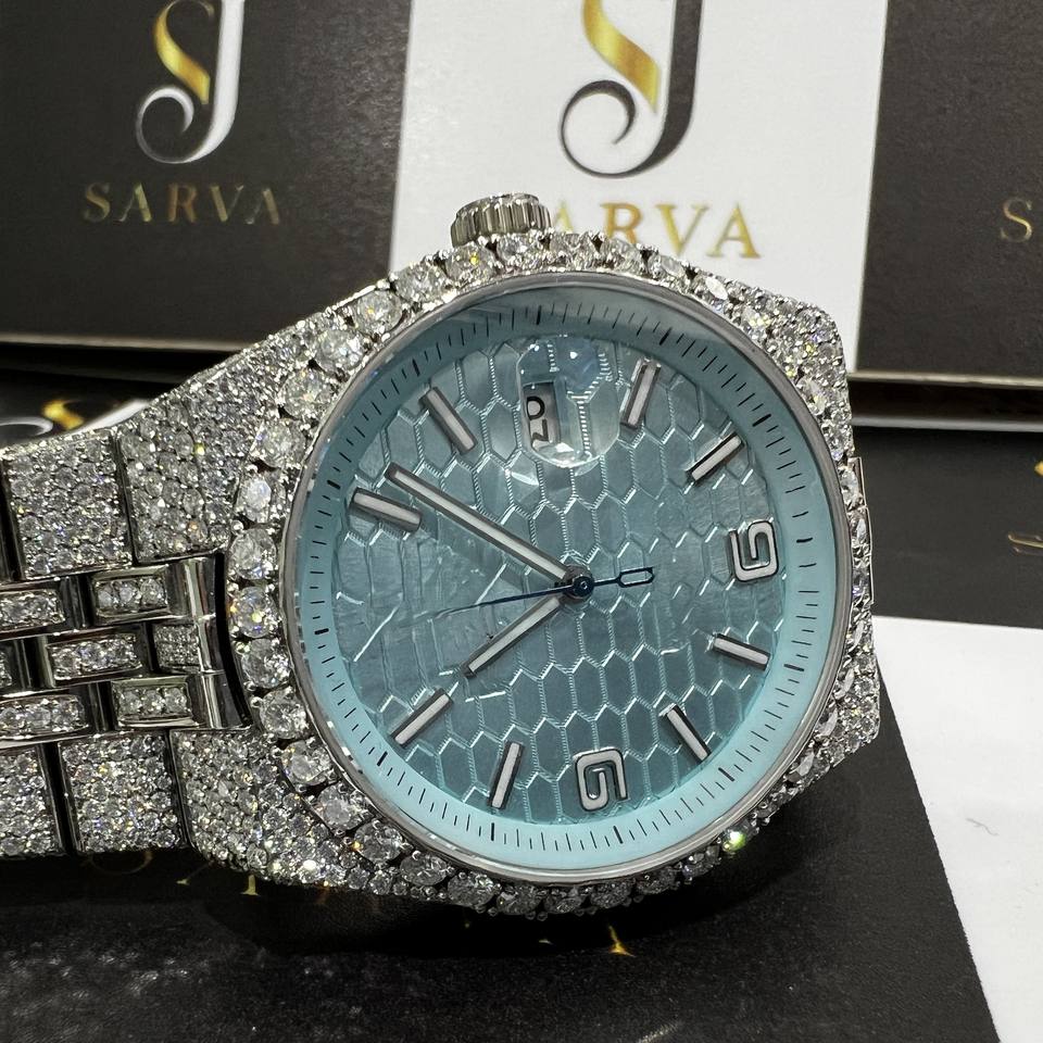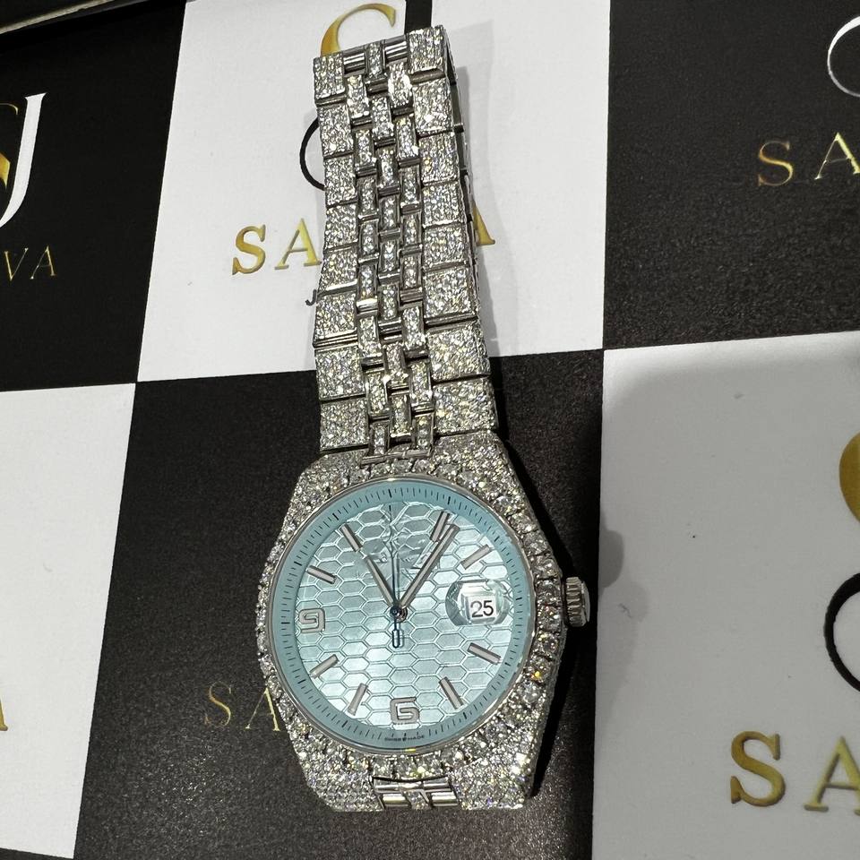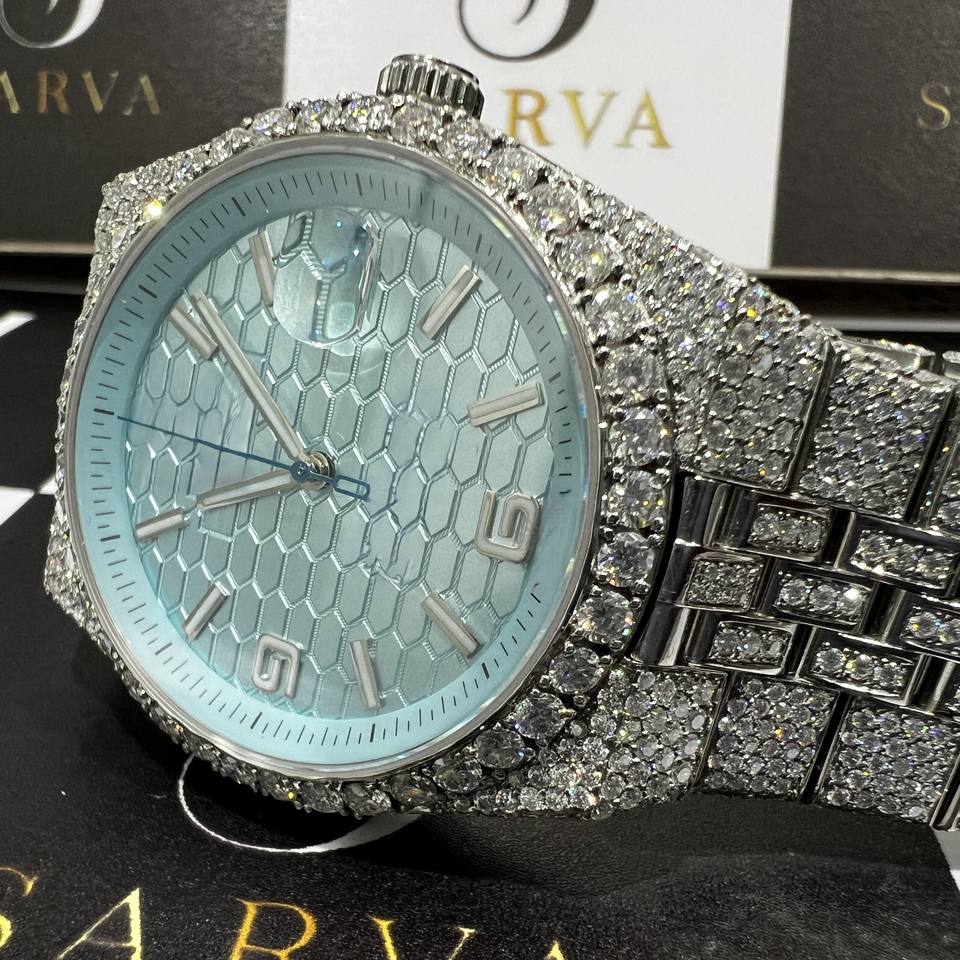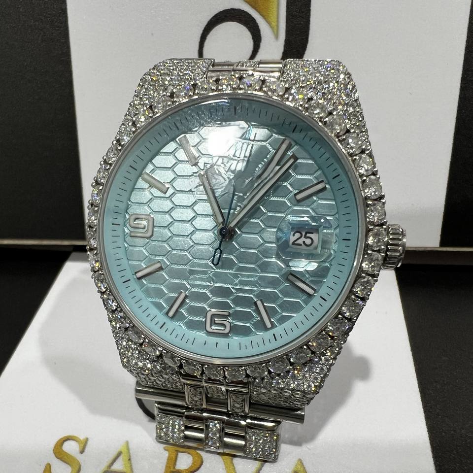 นาฬิกากลไกอัตโนมัติเพชร VVS Moissanite สำหรับผู้ชายหรูหราสายคริสตัลสีขาวเต็มหน้าปัดควอตซ์ปรับแต่งได้