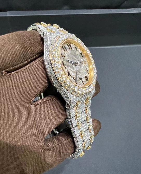 นาฬิกาหรูหรา ตัวเรือนสแตนเลสสตีล หน้าปัดควอตซ์แก้วโบราณ ประดับเพชรโมอิสซาไนต์ VVS สีเหลืองทอง ขนาด 5 มม. 46 มม. ระบบออโตเดท ดีไซน์โดดเด่น
