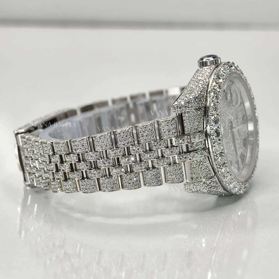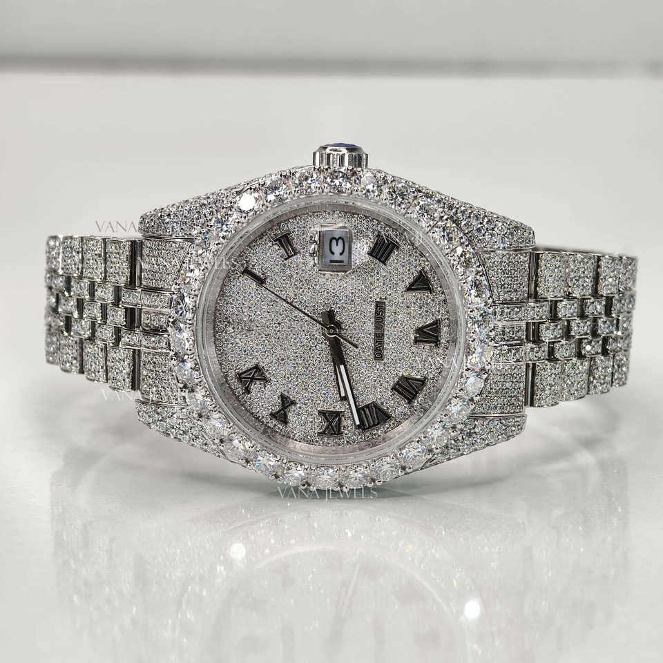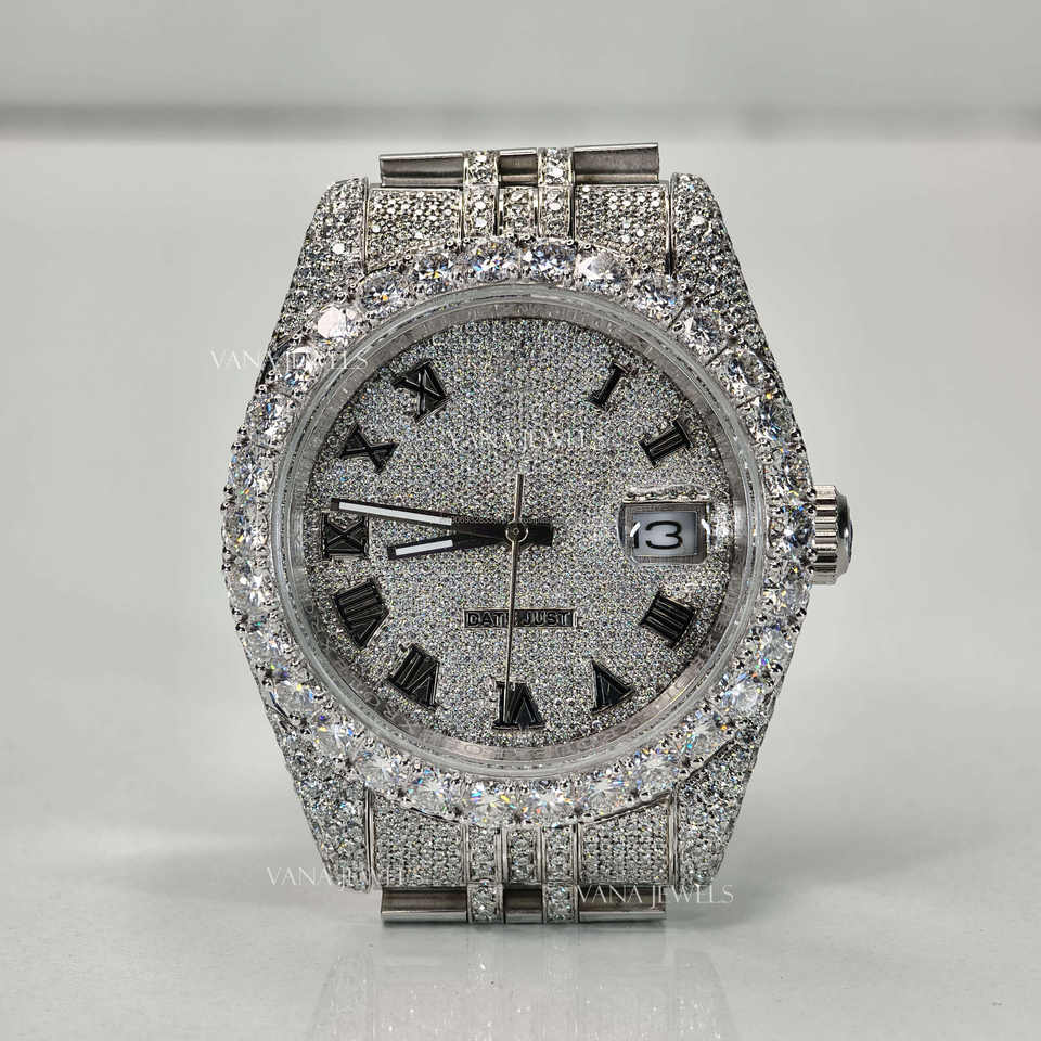 นาฬิกาข้อมือสแตนเลสสตีลสุดหรูสำหรับผู้ชายขนาด41มม. VVS Moissanite กระจกแอนะล็อกแบบโบราณแสดงภาพที่มีคุณภาพสูง