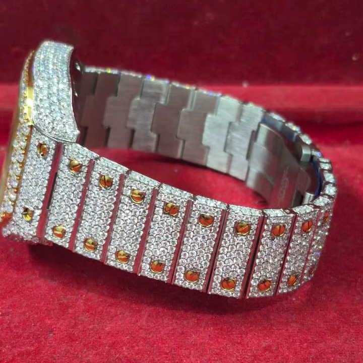นาฬิกาฮิปฮอปดีไซน์โครงกระดูก ประดับเพชรโมอิสซาไนต์ VVS ระดับไฮเอนด์ ตัวเรือนทองเหลืองเคลือบทองคำขาว ขนาด 40 มม. กระจกแซฟไฟร์ สายหนัง