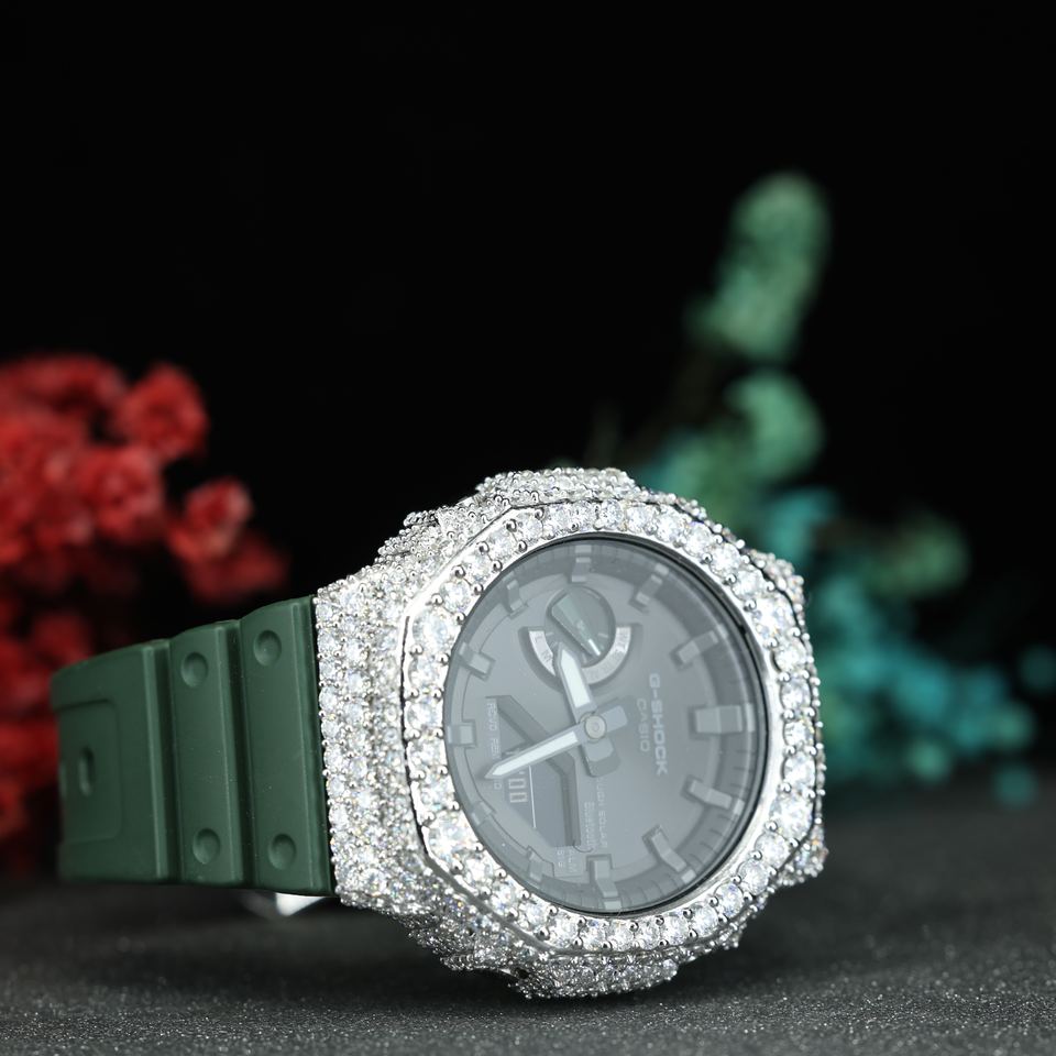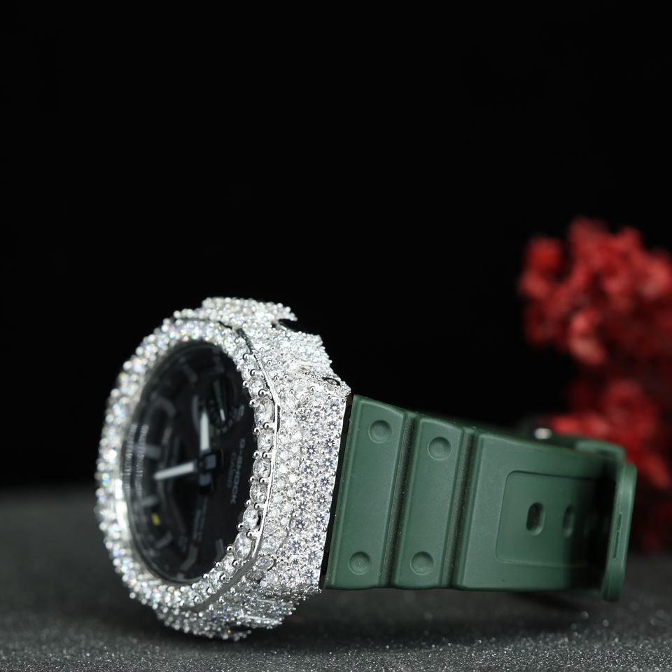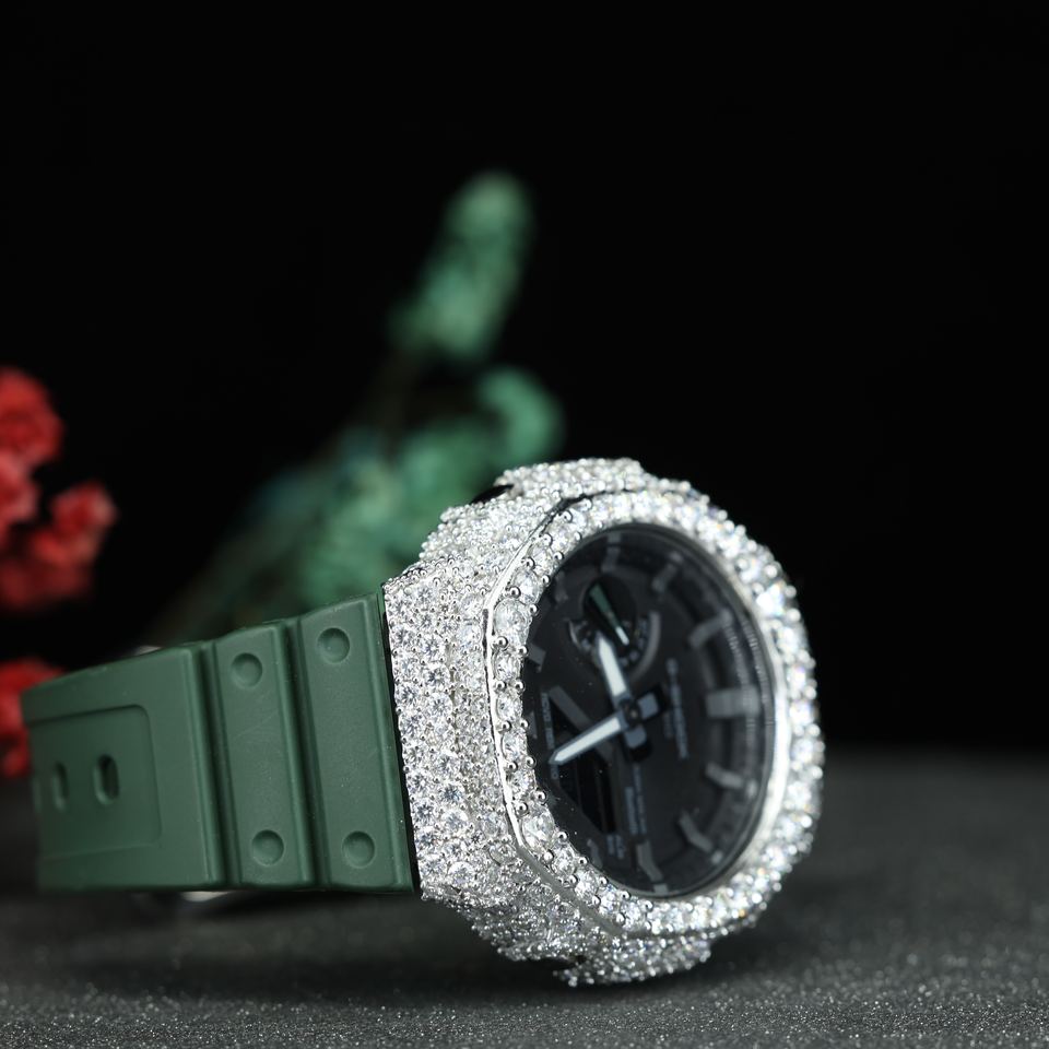 นาฬิกาฮิปฮอป VVS มอยส์ซาไนต์ ประดับเพชรเต็มหน้าปัด สายสีเขียวสุดหรู ระบบควอตซ์ ขายส่ง