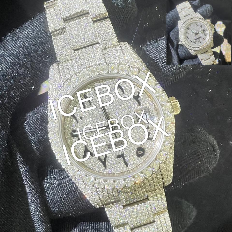 นาฬิกาข้อมือสแตนเลสสตีลประดับเพชรโมอิสซาไนต์ VVS1 หน้าปัดกระจก สายแบบหัวเข็มขัด สองสี สไตล์ฮิปฮอป กันน้ำได้ 10 บาร์